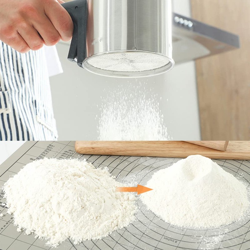 - ✔【MULTIPURPOSE】:3 cup size is ideal for most sifting jobs,Our Stainless Steel flour sifter Perfect for filter flour, cocoa powder, cake seasoning powder,almond powder,powdered sugar,match powder and other podered etc.