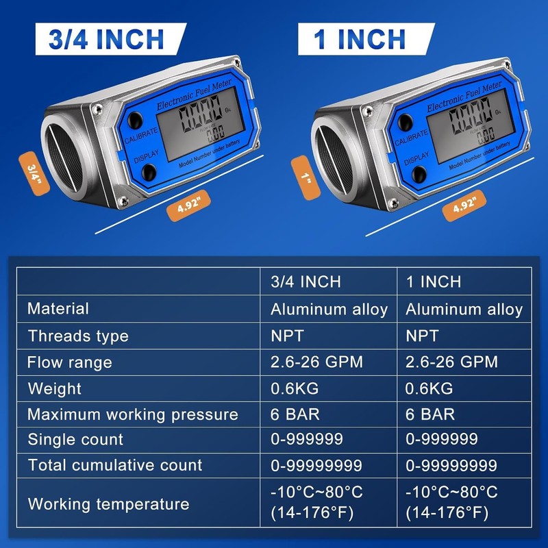 - Versatile Unit Options: The fuel meter support GAL(Gallons), QTS, PTS, L, and m³ units to meet your specific measurement needs, offering flexibility and convenience. Flow range: 2.5-31 GPM (10-120 LPM), working pressure: 6 Bar.