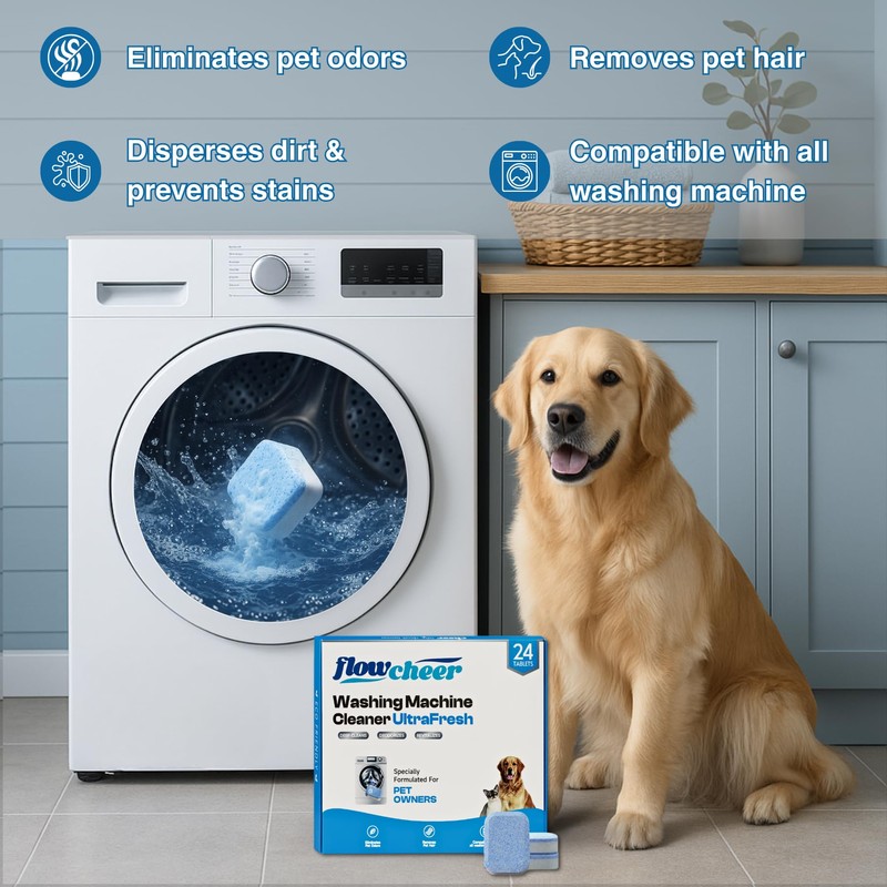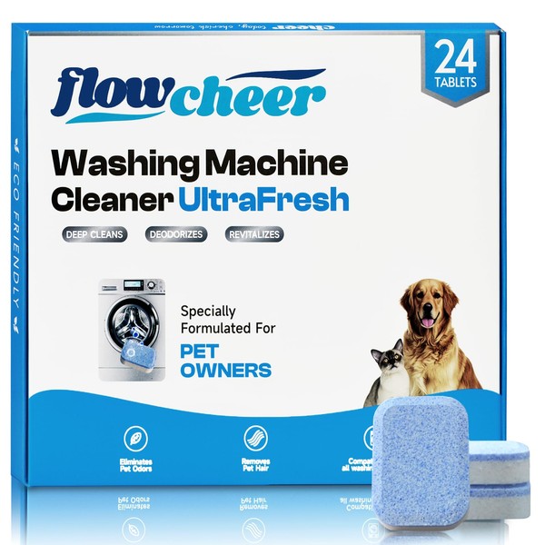 flowcheer Washing Machine Cleaner Tablets, Washer Cleaning Tabs For HE Front Loader & Top Load Washer, Pet Hair Remover, Extra Formulated for Pet Owners, 24 Pack 1 Year Supply, Unscented