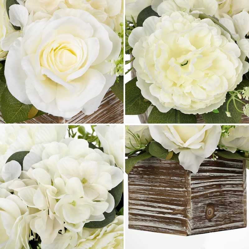 - EXQUISITE MATCH - The artificial flowers in wooden pot is composed of two roses, two peonies and a bunch of hydrangeas. The potted flower arrangements allow you to appreciate the beauty of different flowers, giving you a unique visual feast and bringing warmth to your home