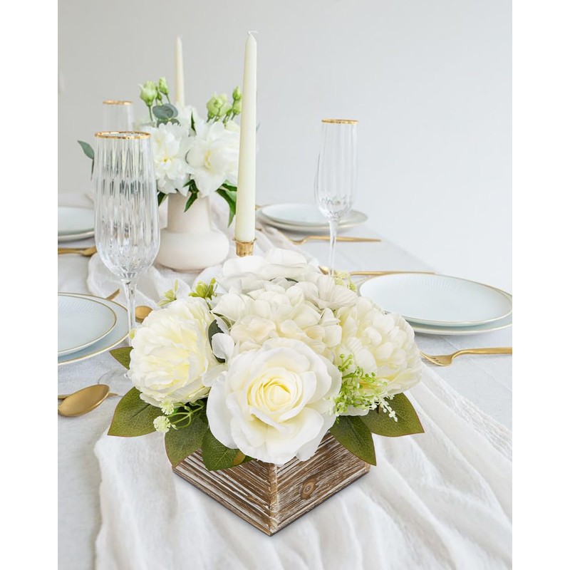 - MEDIUM ARRANGEMENTS - The artificial flowers are fixed in the wooden box, which is just the right size to put anywhere. Does not take up too much space and does not block the view. The petals are soft, and the shape can be fine-tuned manually, making the faux flowers in the pot fluffy, plump and more natural. Wooden arrangement size:5.2"Lx5.2"Wx8"H