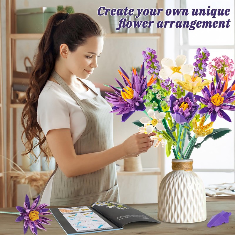 - Unique Design, Suitable for DIY: This bouquet construction set features adjustable flowers, leaf shapes and stem lengths; you can demand for the bouquet to be adjusted and can match freely, romantic, unique and full of beauty. The purple bouquet set can bring you and your kids an excellent DIY experience.
