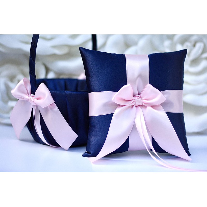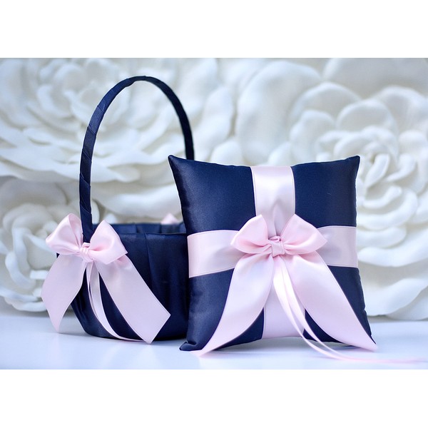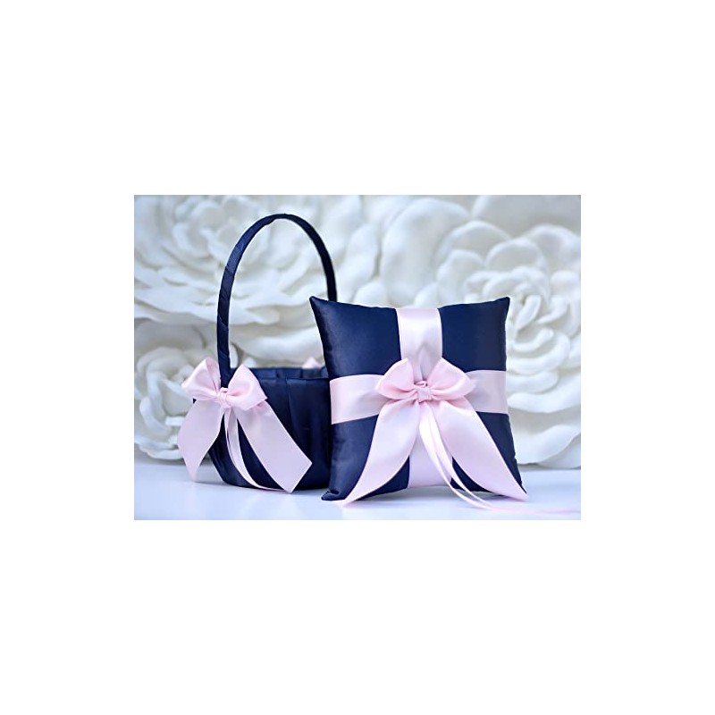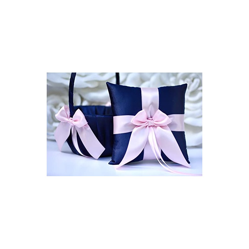 Flower Girl Basket and Ring Bearer Pillow Set in Navy Blue and Pink Color
