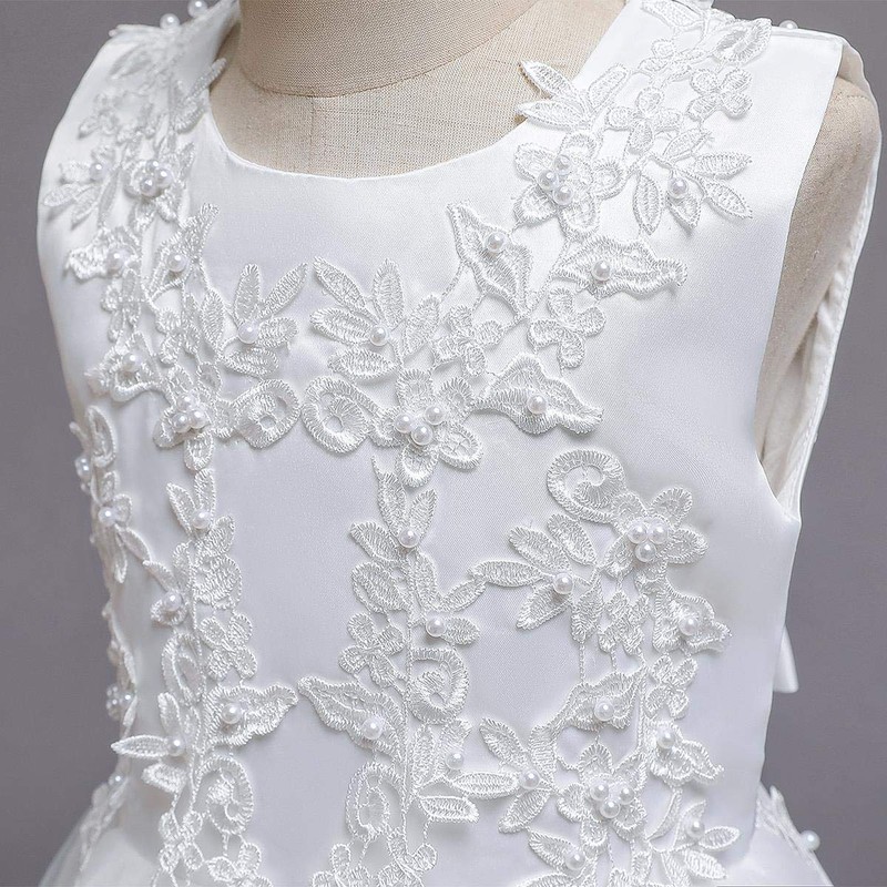 • Features Elegant style princess dress with pearl and lace flower embroidery at front bodice and back,fashion simple sleeveless round neck design, stretch the neckline.Embellished with glittering sequins at second layer of hem, total 4 layers including 2 layers tulle, 1 layer satin and 1 layer soft cotton lining to make the fullness look.Mid-waisted design with bowknot at back waist, looks sweet and cute, with concealed zipper closure at back for easy wearing bring the wearing experience