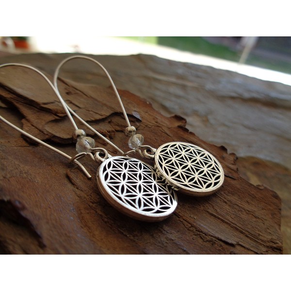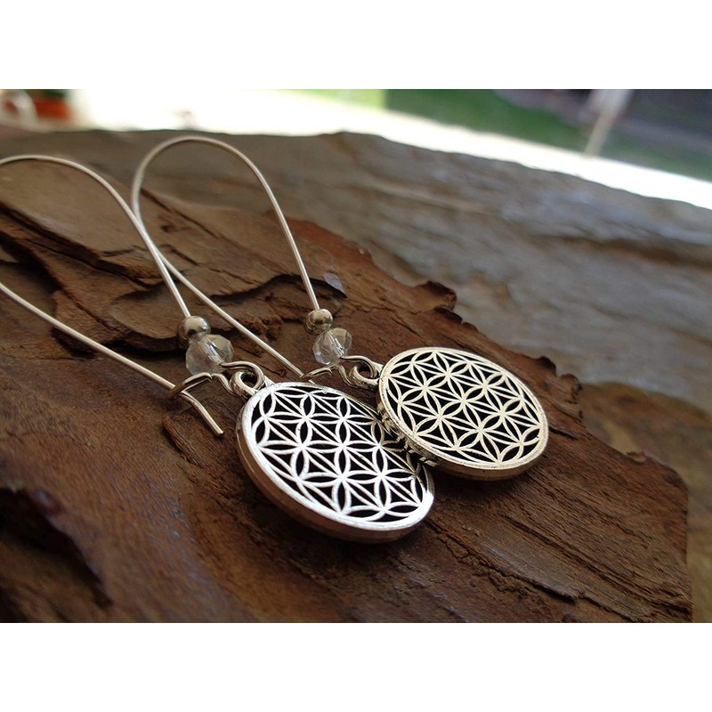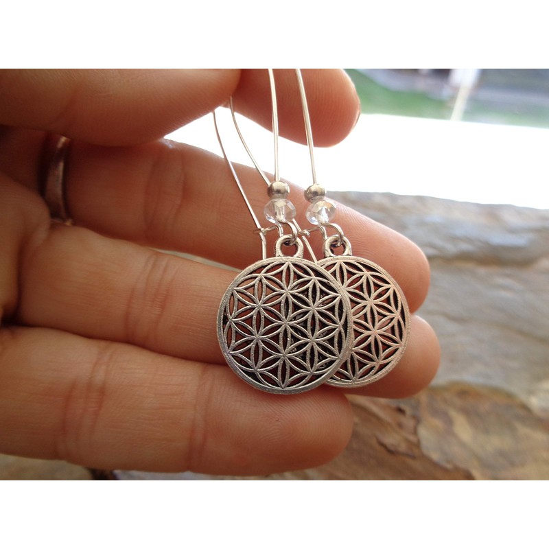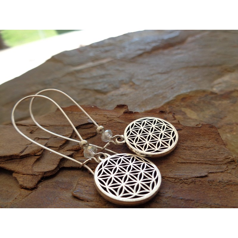 Flower of Life & Small Crystal Earrings in Transparent, Transparent on Long Hooks Flower of Life