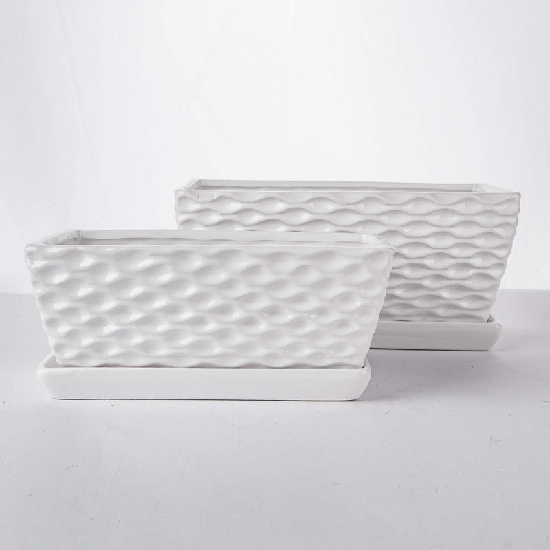 Flower Pots, Rectangular Modern White Ceramic Succulent Pots with Drinage, Garden Pots with Hole, Planter Box with Saucer 2 Set