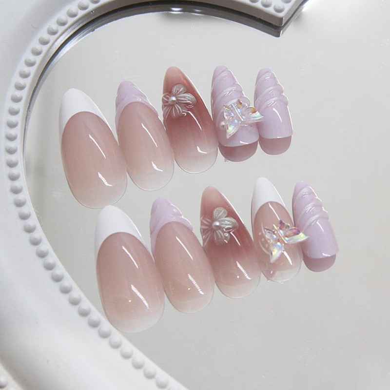 Flower Press on Nails Medium Almond Fake Nails with Designs 3D Butterfly False Nails French Tip Glossy Glue on Nails Full Cover Acrylic Nails Shiny Artificial Stick on Nails for Women Manicure 24 Pcs