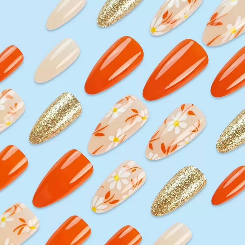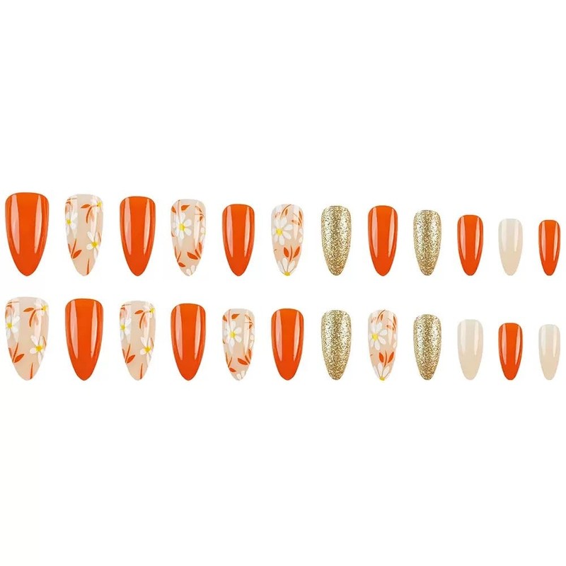 - Almond Press on Nails: There are 24 orange almond acrylic nails in one pack,Beautiful and fashion press on nails Meidum false nails comes with has 12 different sizes. Brush the nail with a coat of polish if you want it to last longer
