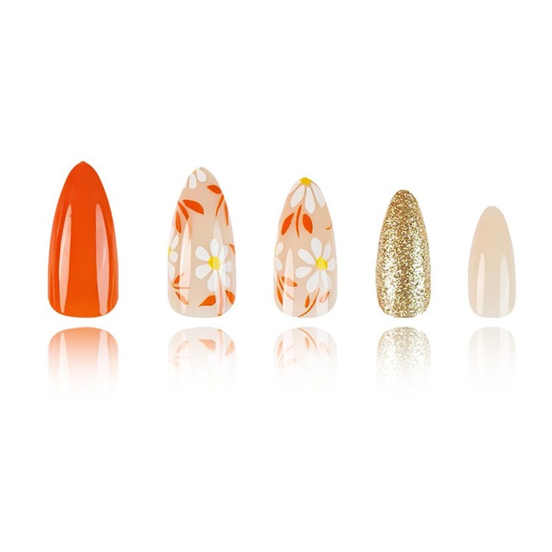 Flowers Press on Nails Almond Medium Fake Nails Orange Floral Acrylic Nails Glossy Spring False Nails Gold Glitter Artificial Nails Glue on Nails for Women Manicure Nails Decoration 24Pcs