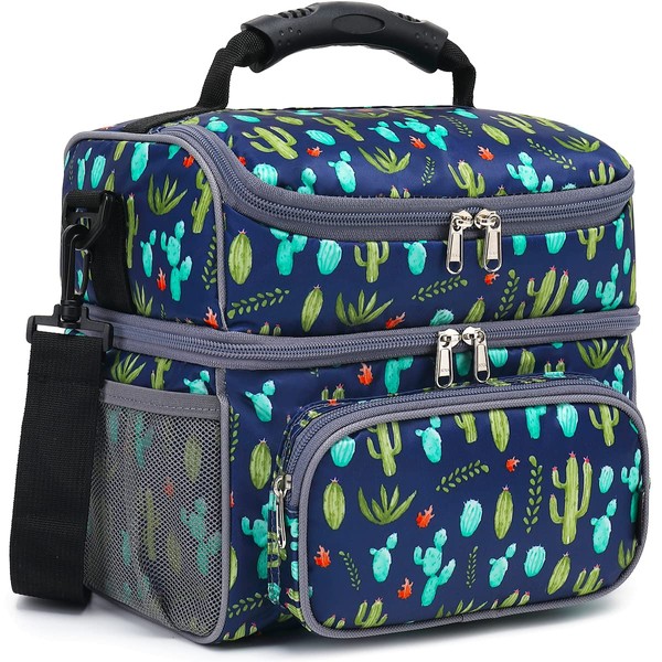 FlowFly Double Layer Cooler Insulated Lunch Bag Adult Lunch Box Large Tote Bag for Men, Women, With Adjustable Strap,Front Pocket and Dual Large Mesh Side Pockets (Cactus)