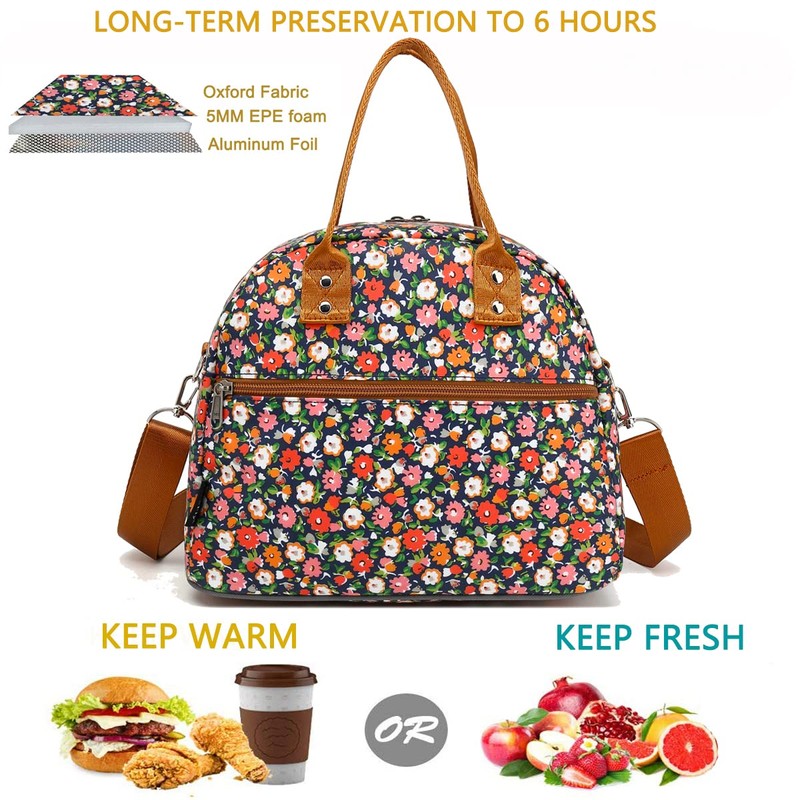 FlowFly Insulated Lunch Bag With Shoulder Strap for Women, Men, and Kids, Large and Reusable, Handle, Freezable Work and School Travel Tote and Meal Prep Organizer,Floral