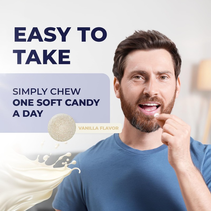 - EASY TO CHEW -Simply chew one soft candy daily, enjoy natural vanilla flavor tablets that fits easily into your daily routine.