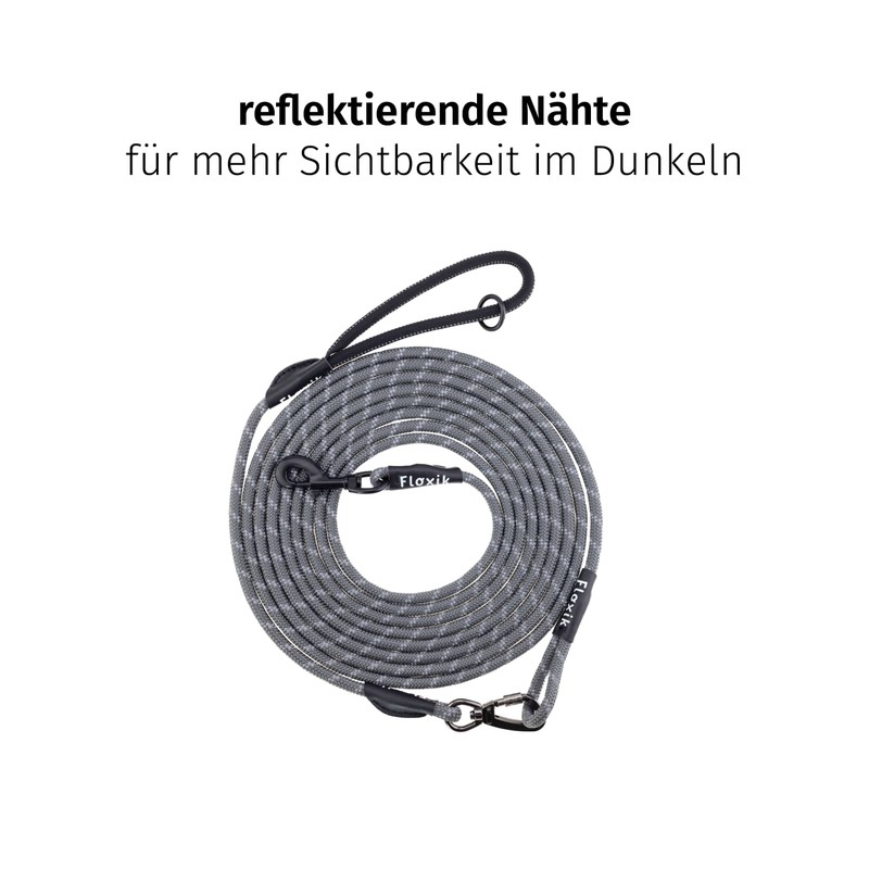 Floxik Recall Lead for Dogs, 5 m, 10 m, 15 m, 20 m, Grey, Reflective Rope Lead with Removable Hand Strap, Also Ideal as a Training Lead for Puppies