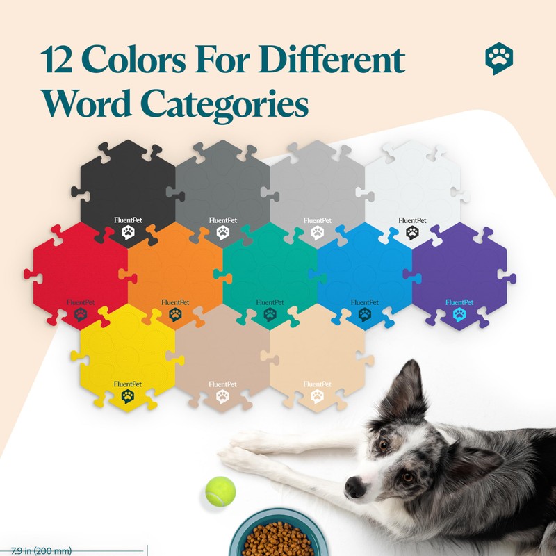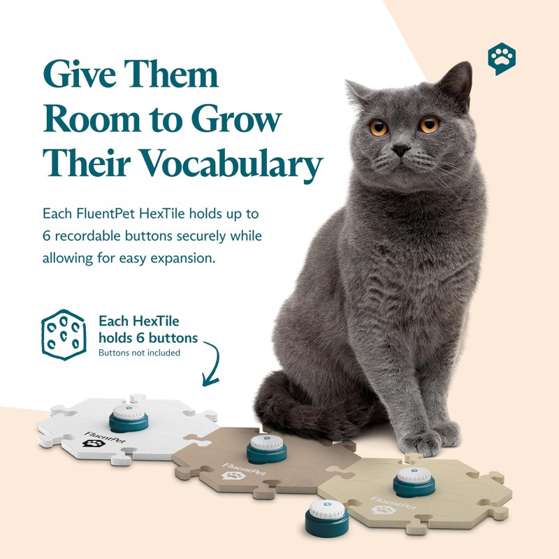 * INCREASE PET VOCABULARY: FluentPet Compact HexTiles are 7.9-inch interlocking tiles designed to securely hold 6 FluentPet talking dog and cat buttons. * FIT MORE IN SMALLER SPACE: Our compact HexTiles take up minimal space at only 7.9 in (200 mm) in diameter and fit snugly together in any configuration you choose. * BOLD COLORS: Make it easy for pets to associate words with the right learning categories. Our tiles come in distinctly different colors that are easy to tell apart. * DURABLE & NON-SLIP: Our quality, soft-top mats are easy on the paws. They’re also durable, non-slip, and easy to set up. * EXPANDABLE SYSTEM: Our HexTiles have puzzle piece connectors that enable you to expand your soundboard as their vocabulary grows