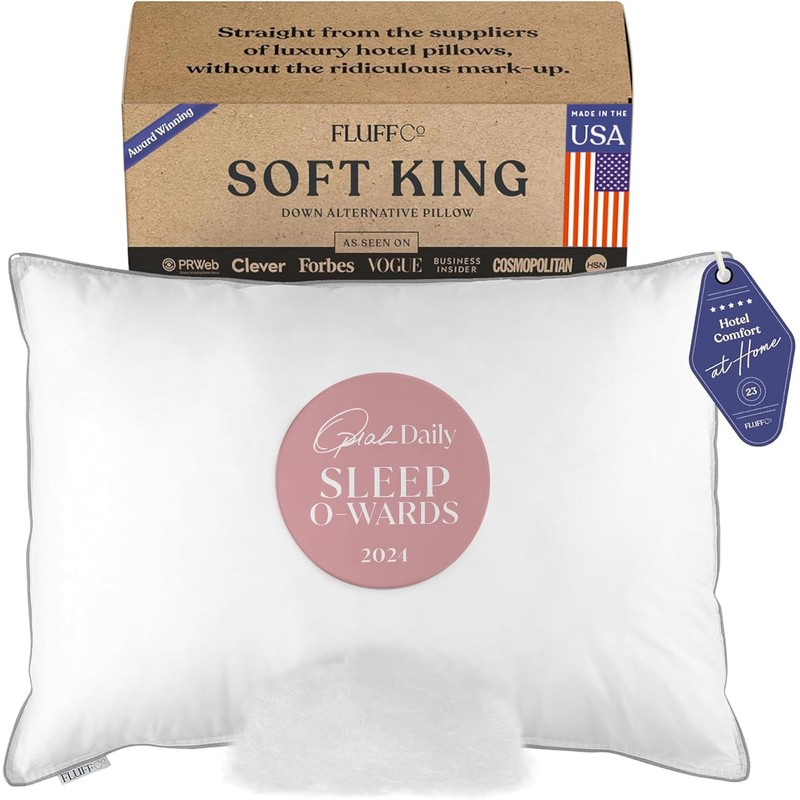 FluffCo Zen Fluff Pillows - Down Alternative - King Bed Pillow for Sleeping Made in USA - Luxury Hotel-Quality Pillow - 100% Cotton, 300 Thread Count (Soft King Size 1 Pack)