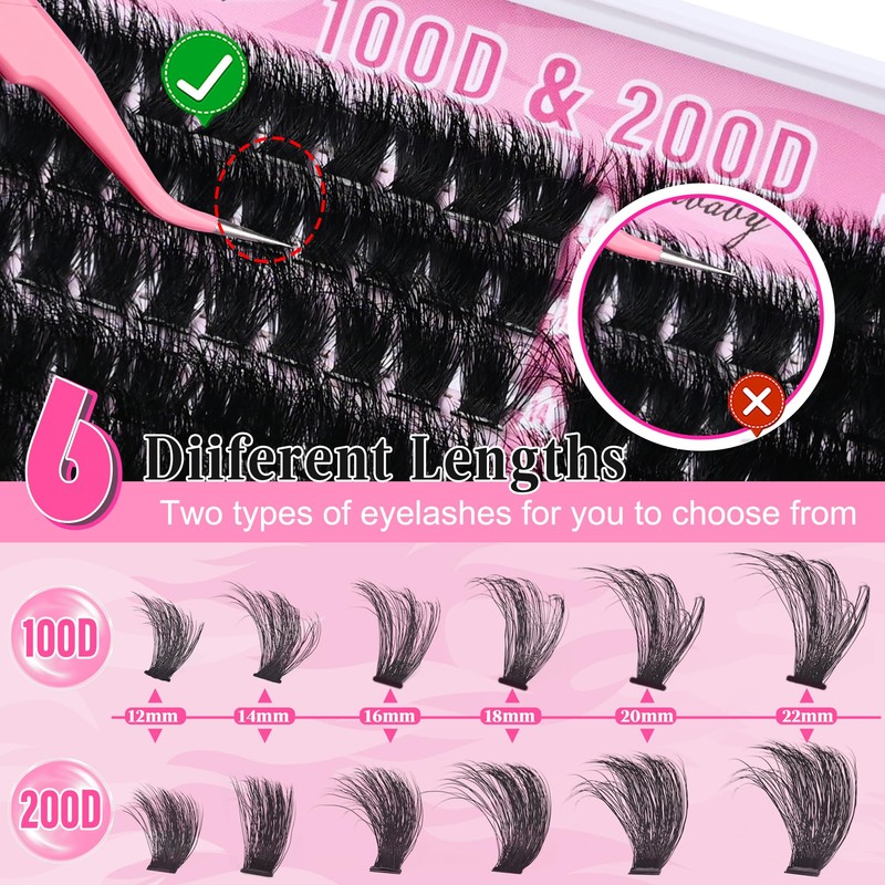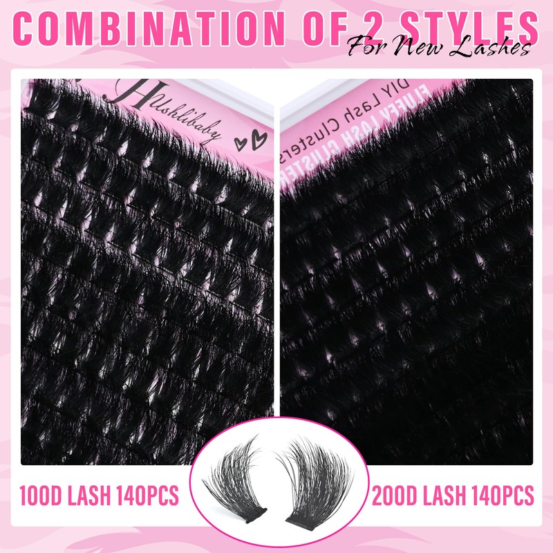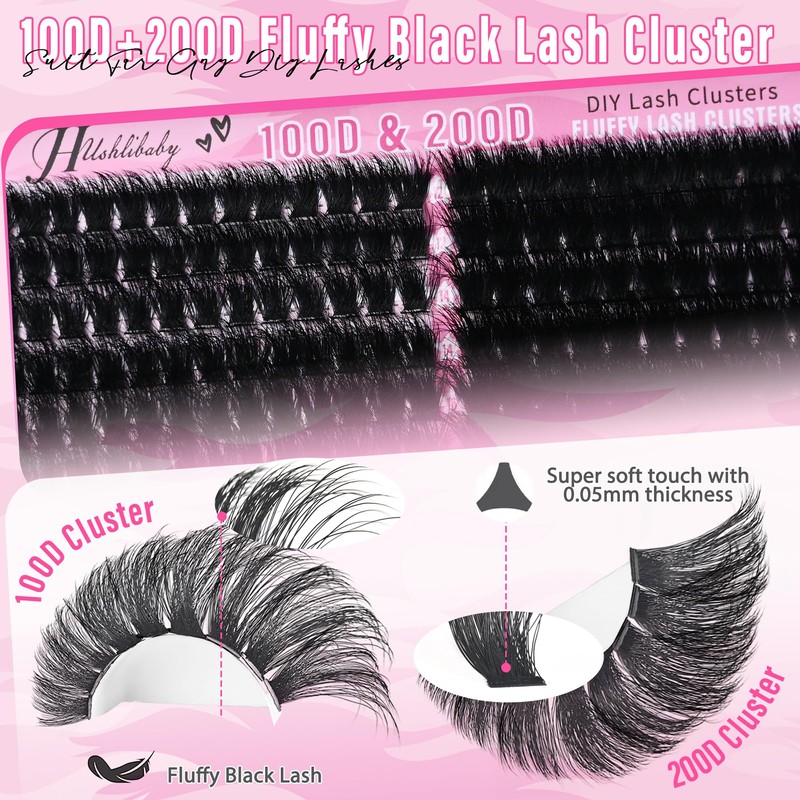 Fluffy Lash Clusters 100D+200D Mega Thick Lashes Clusters 12-22mm Wispy Individual Thick Volume Lashes D Curl Cluster Eyelash Extensions 280Pcs DIY Lash Extension at Home, by Hushlibaby(Plant Fiber)