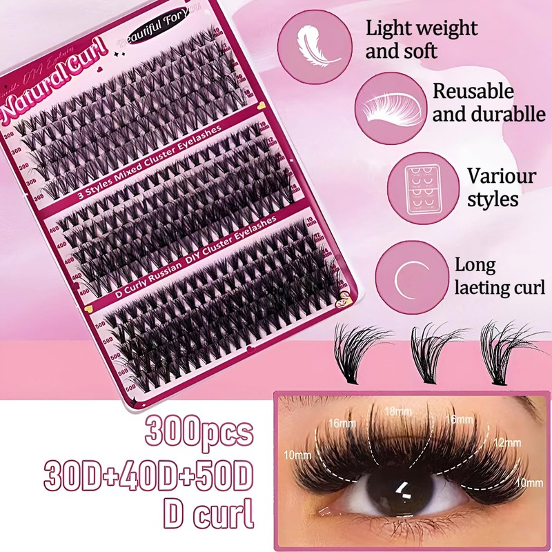 Fluffy Lash Clusters, 300pcs Diy Lash Extensions Kit, 3 Styles D Curl Lashes Individual Cluster, 10-18mm Natural Individual Lashes, With Bond And Seal, Tweezers (30+40+50D)
