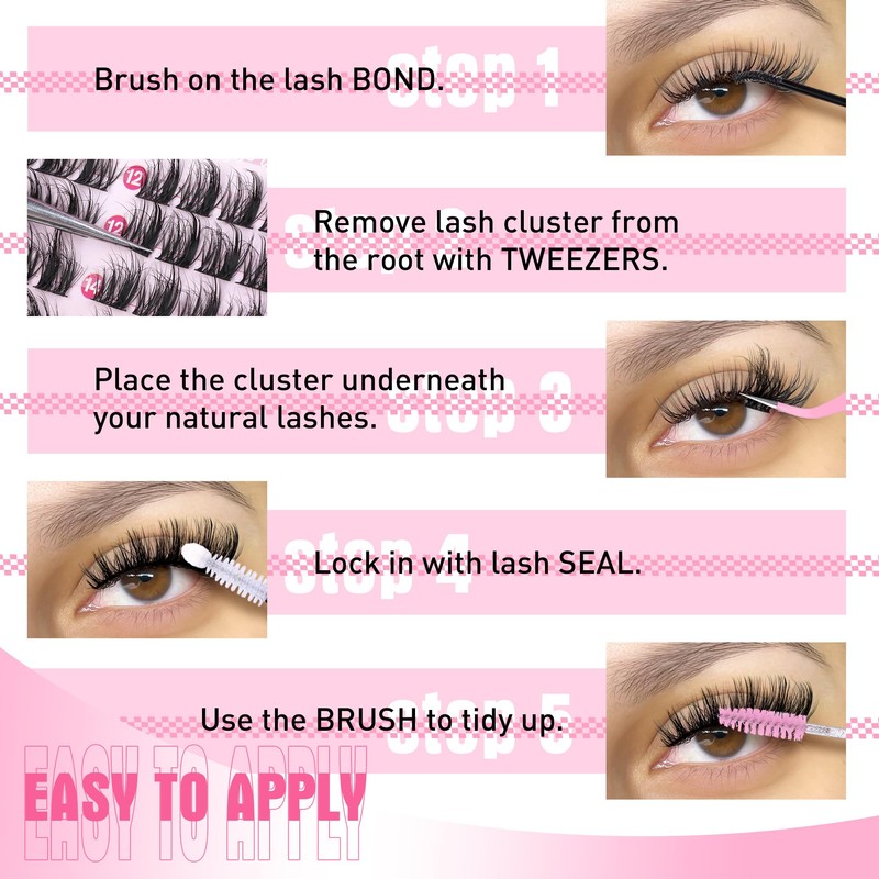 - đžăDIY Eyelashes Clusters for BeginnersăAchieve salon-grade eyelash extensions effortlessly in the comfort of your home, easy to apply even if you are novice, saving you both time and money. If you have any questions about how to apply cluster lashes, don't hasitate to find us for help.