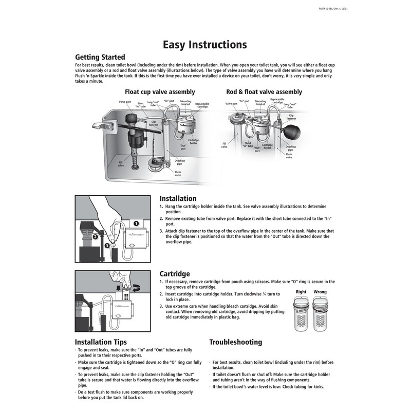 Product DescriptionThe Fluidmaster 8300 Flush n' Sparkle Automatic Toilet Bowl Cleaning System takes the hassle out of keeping your toilet clean. A self-cleaning toilet bowl system that eliminates outdated and damaging tablets and liquid cleaners, it's designed to be a superior solution to tablets by placing a cleaning solution directly into the overflow tube and eliminating damage to flappers and other toilet tank parts. The universal design fits most toilet models and installs in just a few minutes. Step by step instructions are included for an efficient DIY project that keeps your toilet bowl clean and stain free for up to 3 months. The system includes a dispenser, mounting bracket, bleach cleanser cartridge, 2 flexible refill tubes, clip and adapter. Refill cartridges are available in bleach and other cleaning solutions and are sold separately. Relax and let the toilet clean itself with the Fluidmaster Flush n' Sparkle self-cleaning toilet system.From the ManufacturerFluidmaster is the #1 toilet repair brand in the world. Since 1957, we have been guiding our customers to the right toilet repair solutions. Fluidmaster is dedicated to making the installation of its products easy and simple with a complete line of toilet repair parts including: fill valves, single and dual flush valves, flappers, tank levers, toilet seals (bowl wax and wax-free), toilet repair kits, flush valve seals, connectors and more. Fluidmaster parts are found in more toilets than all other brands combined. Fluidmaster distributes to over 90 countries and is the trusted brand by toilet manufacturers and professionals worldwide.