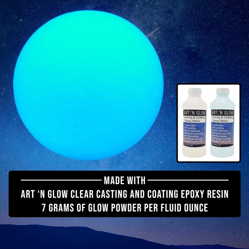 **Glow In The Dark Pigment Powder by Art ‘N Glow** Artists and creators from all over the world use our glow paints and powders for their projects. Usable in any transparent medium, our customers have created resin castings, glow in the dark canvas paintings, star murals, glowing glass figurines, glow in the dark clothing, and more! **What will you create?** Click **“ADD TO CART”** today and be sure to share your creation with us. Our **30 DAY MONEY BACK GUARANTEE** means you can buy with confidence. **Specifications** Glow Time: Up to 6 hours Size: 15-50 um (micron) depending on color Material: Strontium Aluminate, fluorescent pigment (fluorescent colors only) Longevity: Can be recharged millions of times Uses: Resin/rubber/plastic casting, glow paint pigment, fishing lures, glow furniture, luminescent clothing, costumes and props, murals, star ceilings, emergency and industrial applications, nail polish, wax, glue, glaze, etc. Please do not use our fluorescent colors in high temperature applications like glass as the fluorescent pigment will burn. Quantity: 2 ounces (60 grams) Safety: Non-toxic and non-radioactive. Made from naturally occurring rare earth aluminates. Do not ingest or inhale. Best charged in the sun or with an ultraviolet/black light. A FREE ultraviolet keychain light is included with each bag of powder. i.e. one light per 2 ounces. What’s included: Glow powder in a reclosable plastic bag, charging light, application cheat sheet and links to additional tips and resources