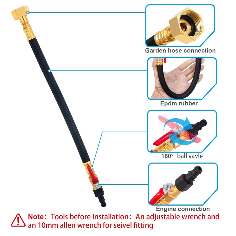 • ★Package including: 1 hose,1 ball valve,1 Yamaha connector,1 Swivel 1/4" to 3/4" connector,Matching washers,with 2 Teflon Tape .Max Pressure rating: 300 PSI. Temperature: -22℉ ~ +250℉. Hose Pipe Length: 12 inches.Buy with confidence with one year warranty.