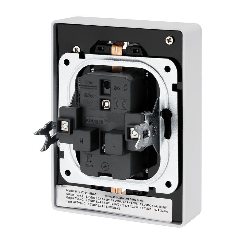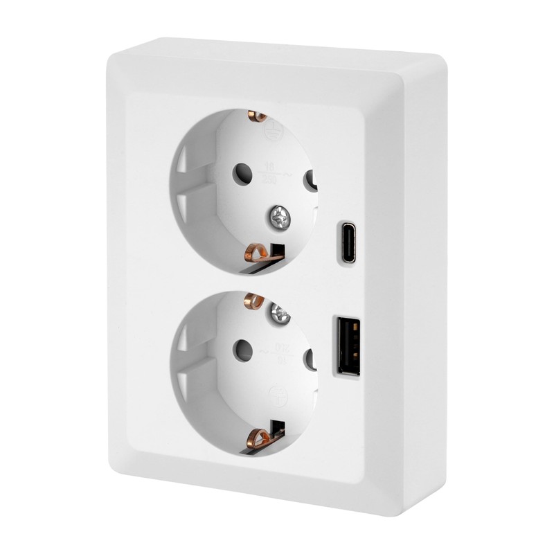 Compact flush-mounted double socket with 2 x USB ports. Fits into a standard flush-mounted socket.