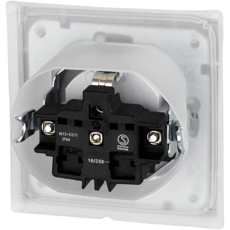 Compact and stable wet room recessed socket with spring cover and plug-in protection. Splash-proof, incl. Silicone Ring Ideal for use in the balcony, terrace and bathroom. All-In-One – already pre-assembled including frame, flush-mounted insert and cover.