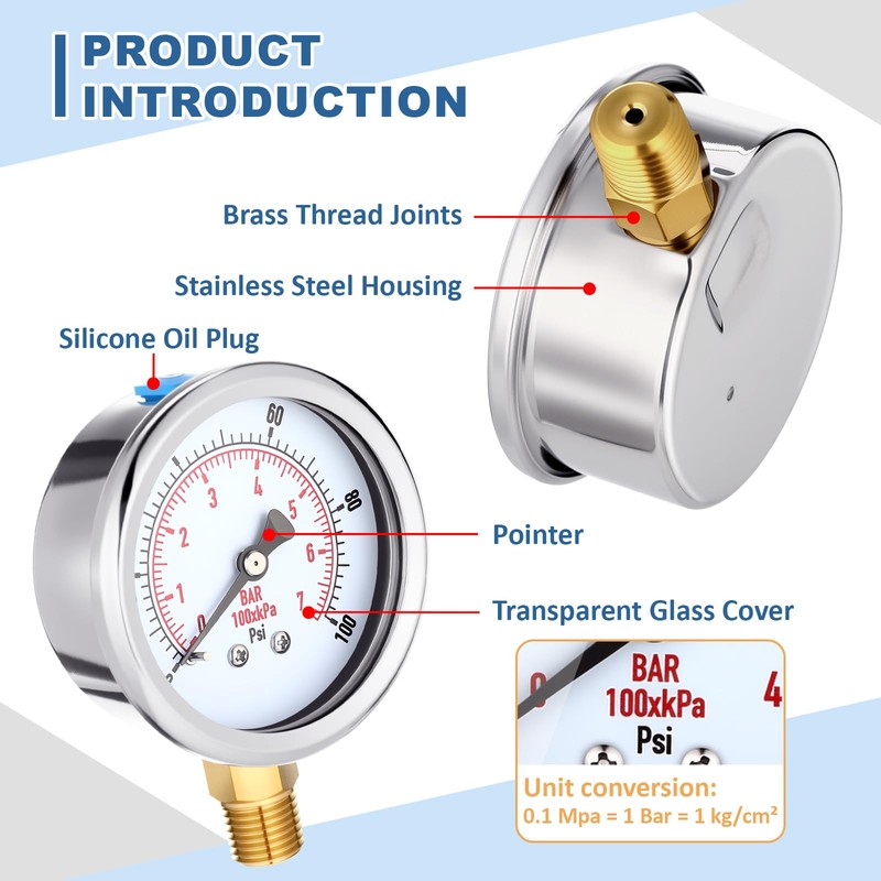• Easy to Install: 0-100 psi pressure gauge lower mounting male connector with 1/4 inch npt thread