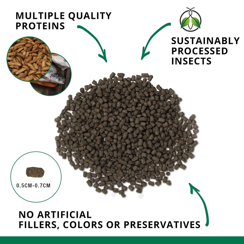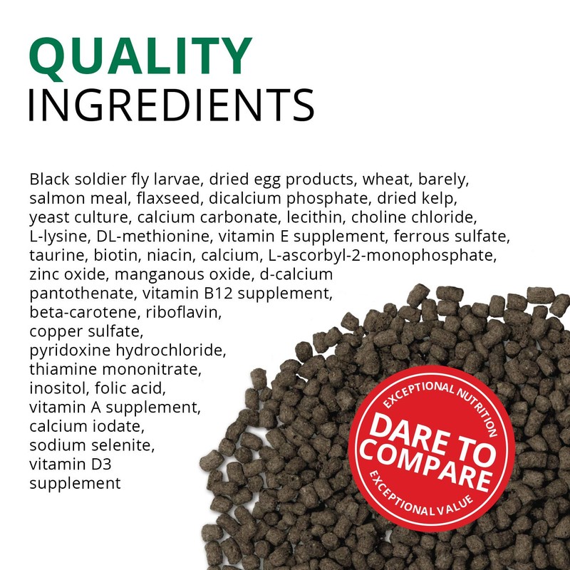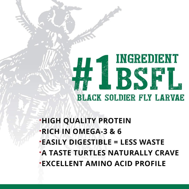 - Turtle food that contains up to 40%, nutrient-rich Black Soldier Fly Larvae, the first ingredient