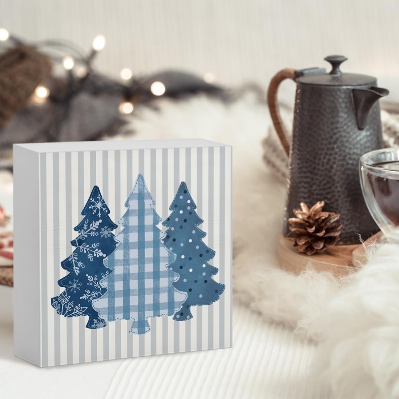 FLVGE Winter Christmas Trees - Rustic Blue Wooden Box Sign Decor, Indoor Home Shelf Desk Decor 5x5