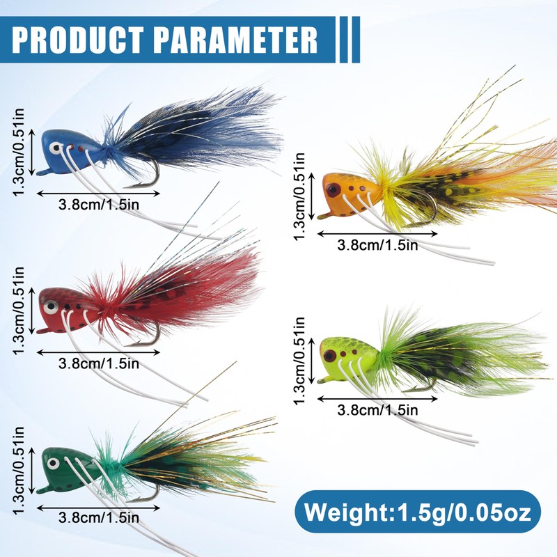 - 🎣【Extremely Lifelike Poppers】Fly fishing popper flies kit which has vivid front legs, eyes, lifelike feather and fluffy wings. In still water, a slight twitch of the line produces a subtle "bloop", just like the real flies resting on the water surface. Predators can't resist this!
