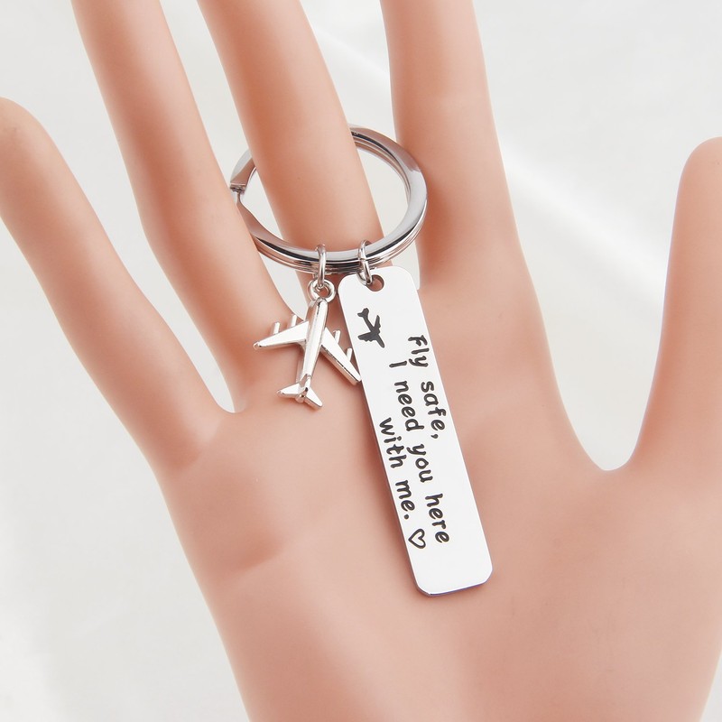 - The stainless tag is hand stamped with "fly safe" and the keychain includes the airplane charm.