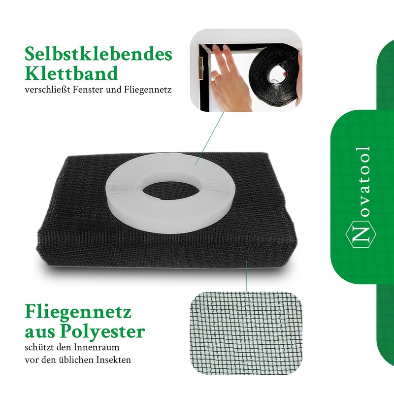- The dimensions of the window net are 150 x 180 cm and can be cut to size. The tape has a length of 6.60 m and is 9.5 mm wide. The Velcro tape sticks with an acrylate adhesive. The mosquito net is in anthracite.