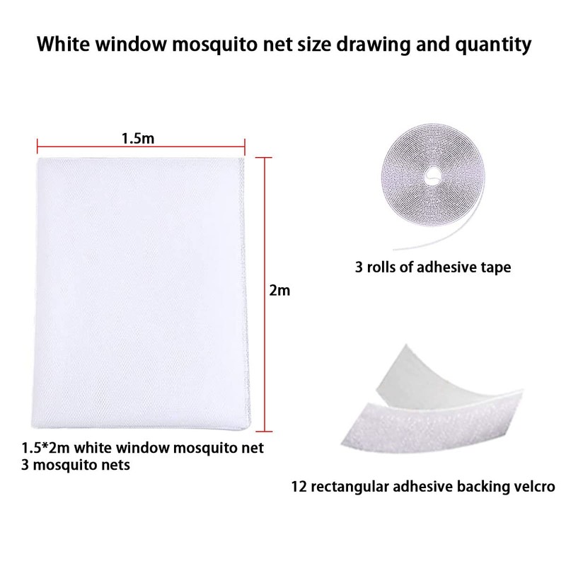 - Specification package: 3 x window nets, 3 rolls of self-adhesive tapes, 12 x self-adhesive tapes, mesh net size is 150 x 200 cm.