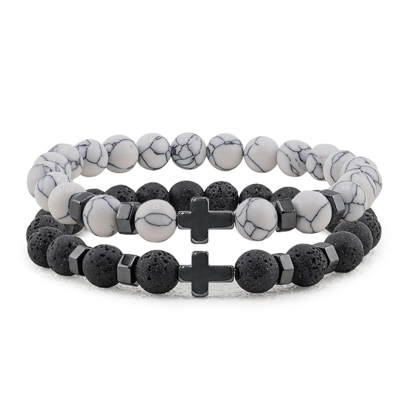 Flybar Religious Bracelet 8mm Black adjustable Beaded Cuff Charm Bracelets for son Husband Elegant Cross Bracelet, L (6.6"-7.5"), Stone, Agate