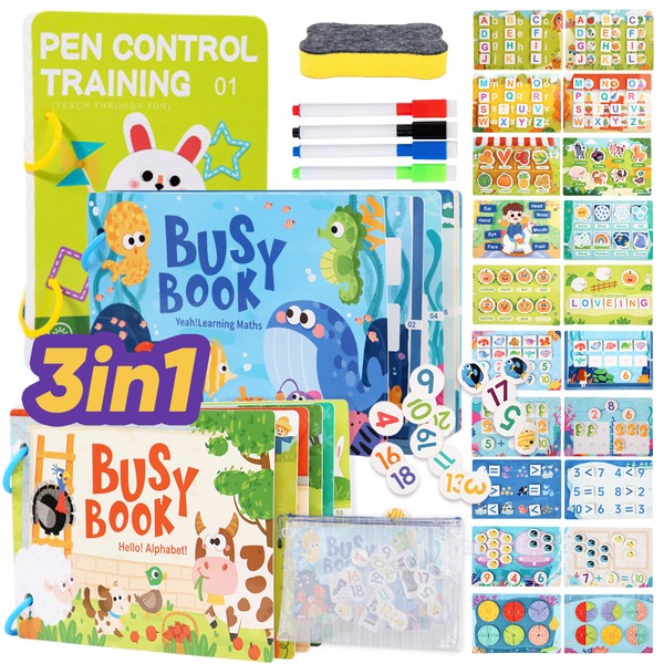 Flybean 3-in-1 Montessori Preschool Busy Book for Toddlers, Kids Age 2+,Educational Sensory Book, Birthday/Christmas/Valentine Gifts for Boys, Girls(8" Letters&Math Sets)