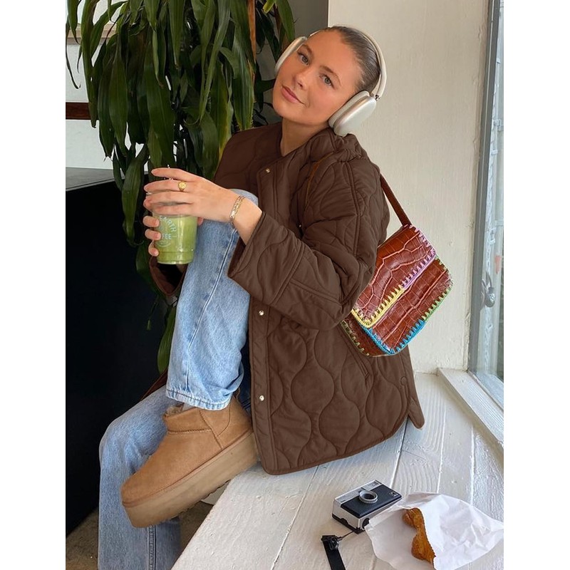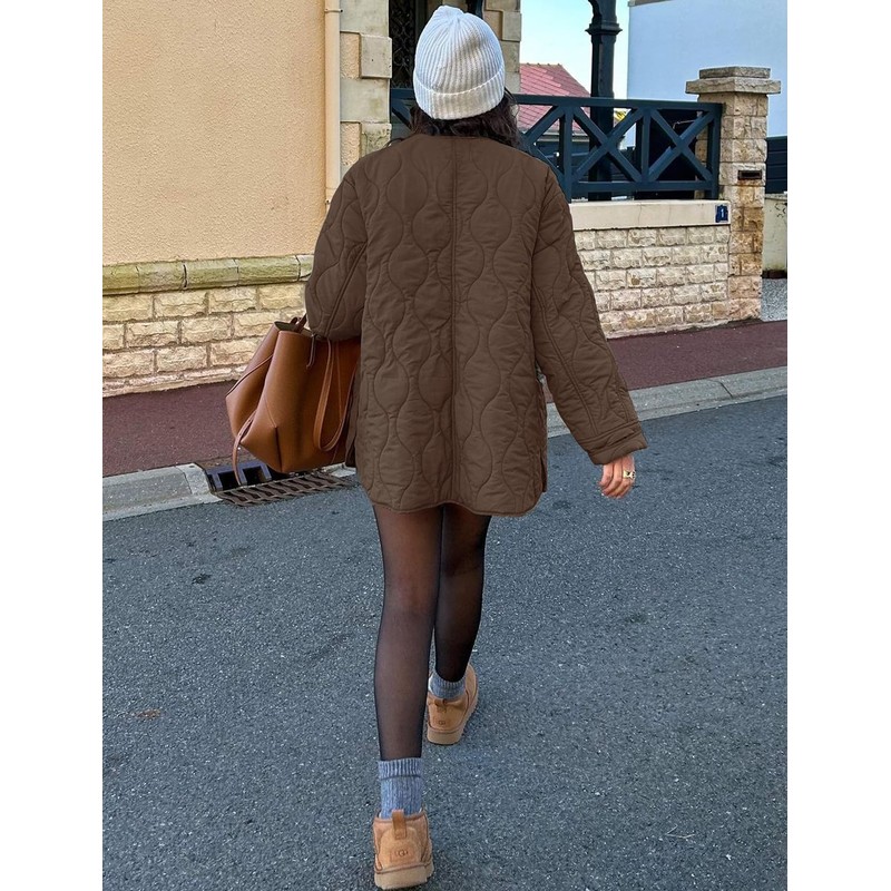 Flygo Women's Oversized Quilted Lightweight Jacket Button Down Puffer Padded Outerwear with Pocket(Coffee-L)