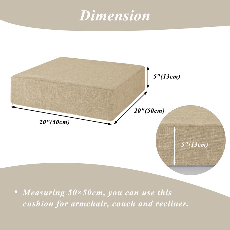 - Size and Details: 20x20x5 inches, please measure the size of your chair first. The specially enlarged and thickened square chair cushion can meet your need to get a comfortable chair cushion. Include 1 pcs square cushion in the package.