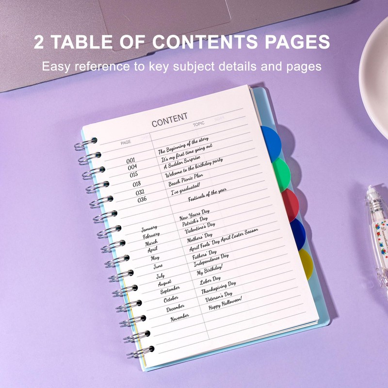 - 【Durable PP Cover Lined Journal Notebook】Thick PP front and back hardcover. Thick PP front and back hardcover. Spiral notebook 5.5 x 8 features a sturdy frosted PP hardcover, this notebook resists wear and tear while protecting your notes. The anti-flip design includes a convenient pen slot, and the 80gsm ivory paper reduces eye strain while preventing ink bleed-through. Plus, 3 content pages make tracking notes a breeze.