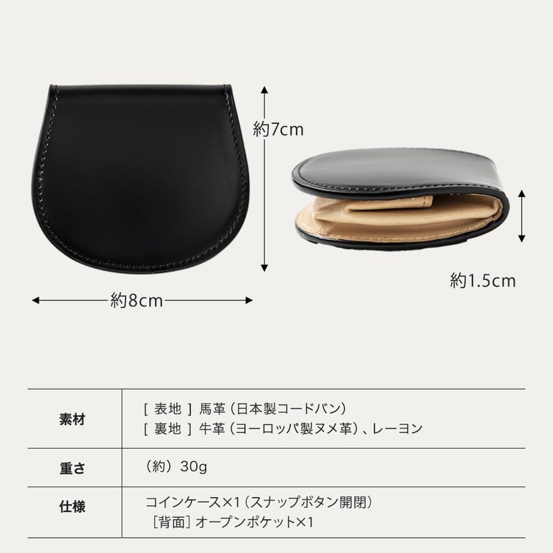 • (Specifications) Material: Outer Material: Horse leather (made in Japan) Lining: Cowhide leather (tanned European leather), Rayon Size: Approx. H 2.8 x W 3.1 x D 0.6 inches (7 x 8 x 1.5 cm); Weight: Approx. 1.1 oz (30 g); Specifications: Coin case x 1 (snap button opening); Back: Open pocket x 1, Production: China/Vietnam