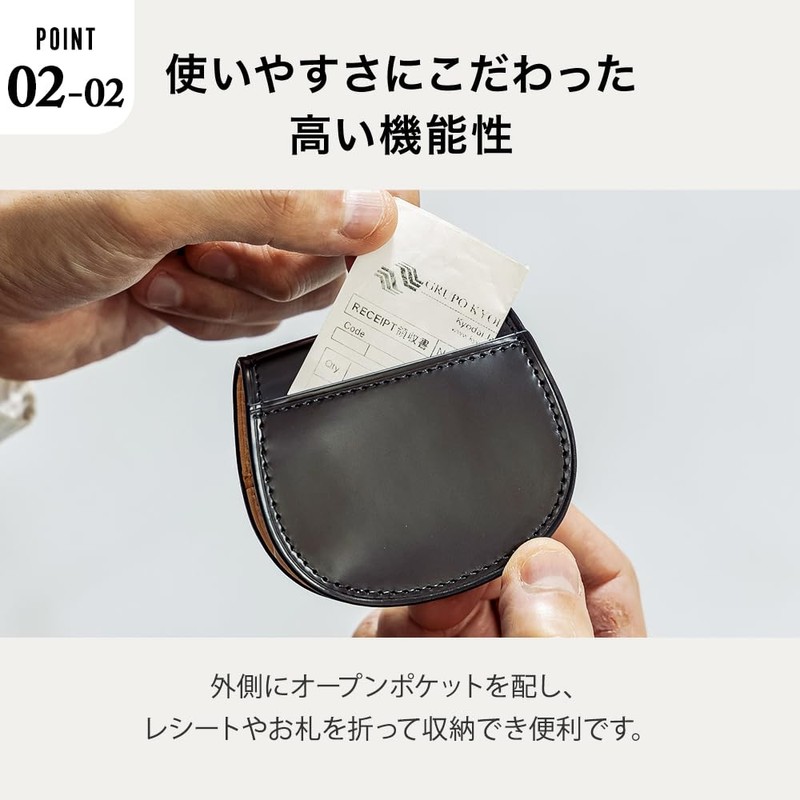 • Features: Horseshoe shaped coin case opens wide at the entrance so you can easily check the contents inside. The engraved logo on the inside is proof of the Miyauchi Industry Japanese Cordovan