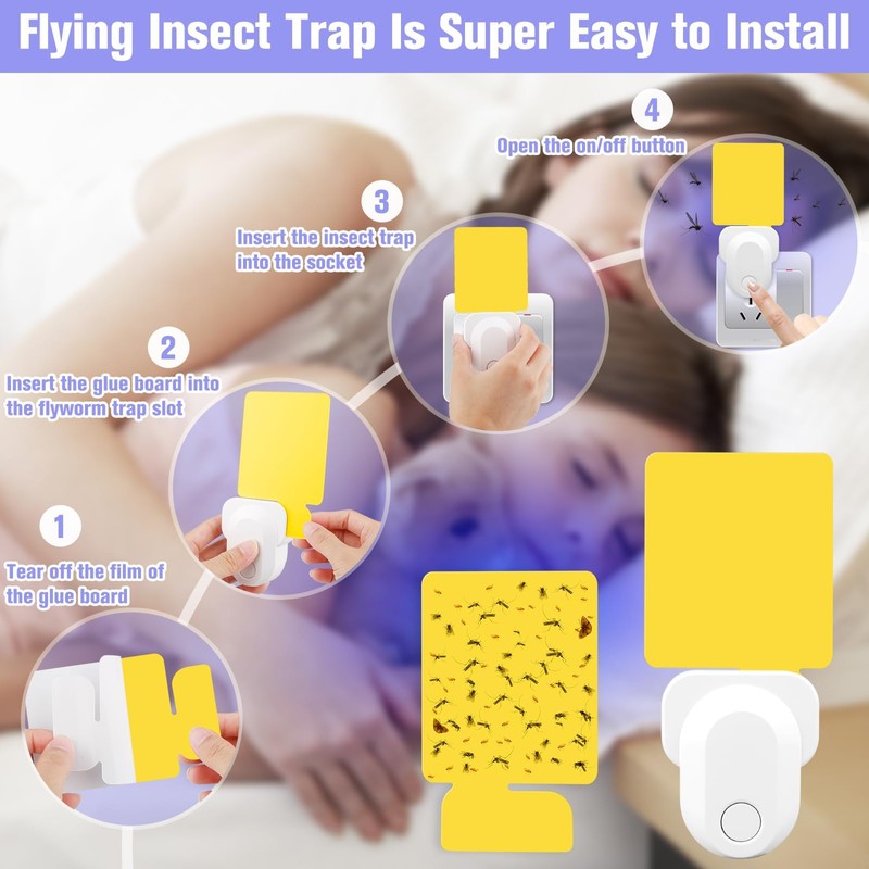 - Effective UV Light Insect Trap - Our upgraded UV light insect trap uses phototaxis to attract flying insects such as flies, gnats, and moths. The UV light draws insects in, where they become stuck to the powerful yellow glue card. Comes with 5 glue cards for effective trapping. Ideal for use as fruit fly gnat traps for house indoor