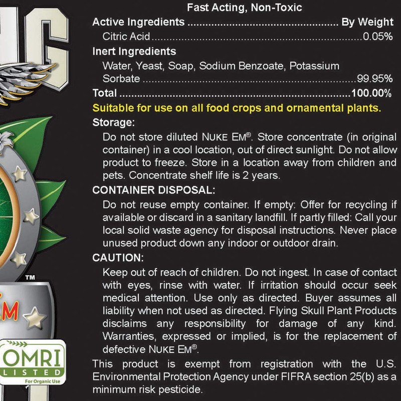 Nuke Em® insecticide/fungicide is a pesticide that has been proven effective in both hobby and commercial grows and its purity is verified. It targets all species of Broad Mites, Russet Mites, Spider Mites, Leaf Aphids, Whitefly and other plant leaf parasites. Its unique formula also allows for outstanding control of powdery mildew found in the garden. Nuke Em® uses ingredients that are either food grade or organic listed which makes it skin contact friendly. Nuke Em® does not have any heavy oils or detergents in the formula that could slow plant growth or make produce taste bad. It may be applied throughout the grow cycle and if need be applied after harvest. Commercial growers will be happy to know that Flying Skull is very serious about Nuke Em’s quality. Flying Skull Plant Products has identified 59 unlawful pesticide ingredients known to fail laboratory testing of food grade produce. Each batch of Nuke Em® has been laboratory tested for purity to make sure those 59 unlawful pesticide ingredients along with yeast, mold and bacteria are not in Nuke Em®.