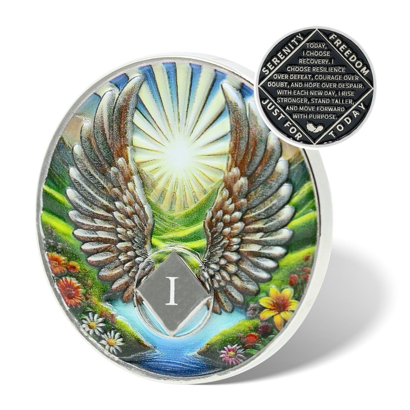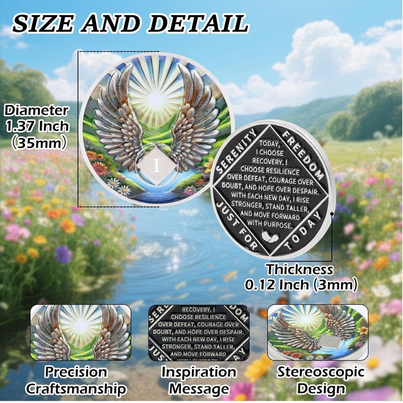 - Inspirational Design - This addiction recovery coin features an elegant design with wings spread across a peaceful landscape, symbolizing freedom, hope, and resilience.