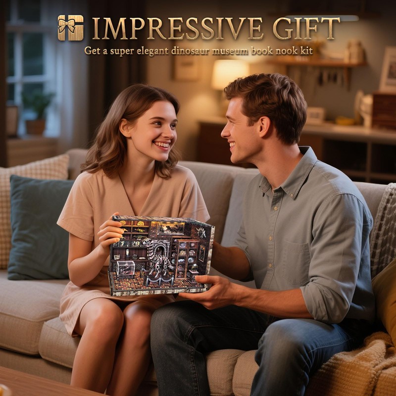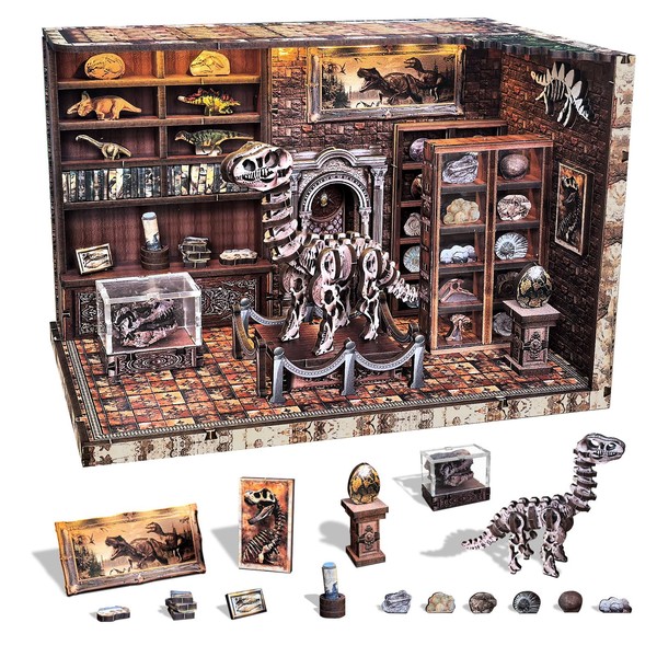 Flyintoys Book Nook Kit, DIY Miniature Dollhouse Booknook Kit for Adults and Teens, 3D Wooden Puzzle Bookshelf Decor Crafts Kits with LED Light for Family and Friends (Dinosaur Research Institute)