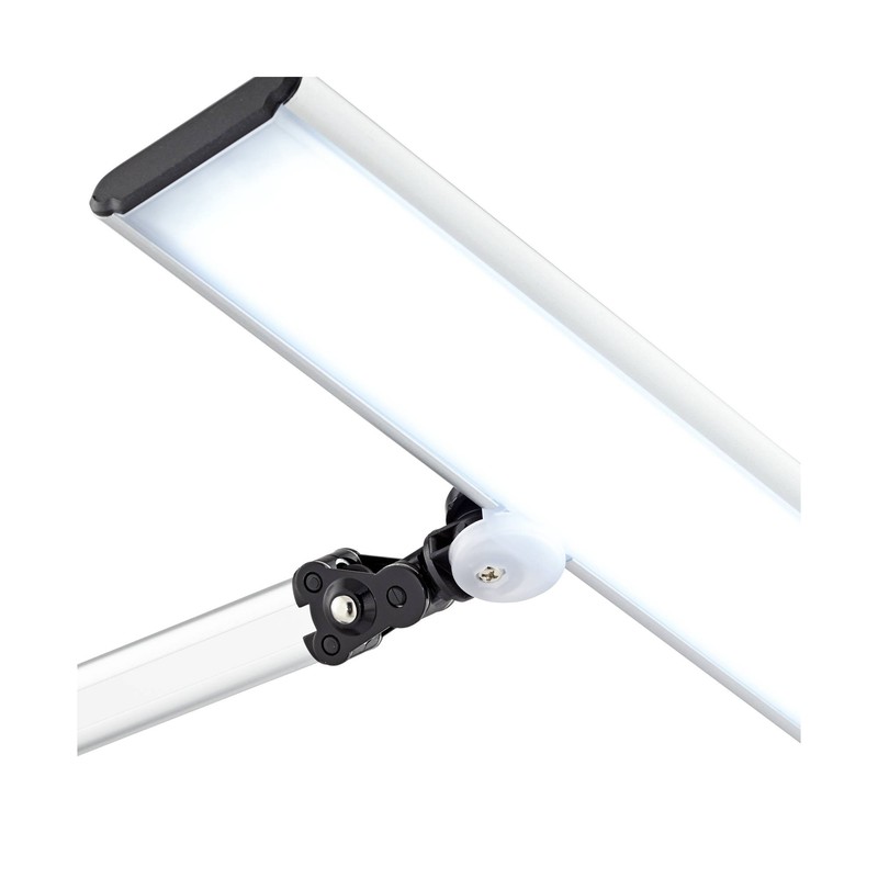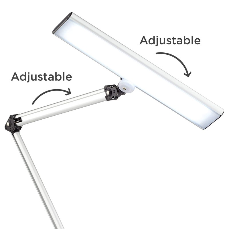 - Adjustable to 25" high. Lamp head is 12" wide x 3" deep. Arm segments are 10" and 12" long. Base is 8 1/2" wide x 4 1/2" deep x 1" high. Weighs 3.2 lbs.