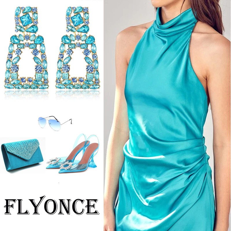 Flyonce Large Statement Drop Earrings for Women Boho Jewelry, Sparkle Rhinestone Crystal Geometric Rectangle Dangle Sea Blue
