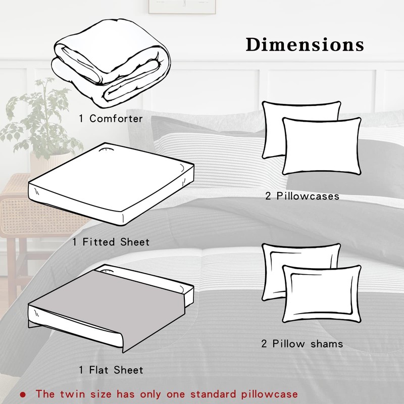 - [Set] 💎7 Piece King Size Bed in a Bag Includes - 1 King size comforter 102”x88”, 1 King Fitted Sheet 78" W x 80" L + 12", 1 King Flat Sheet 102" W x 105" L, 2 pillow shams 20”x36”, 2 King Pillowcases 20" W x 40" L, The fitted sheet is 12 inch Pocket. Fits mattresses up to 12".