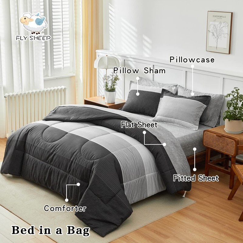 FlySheep Ombre Striped Bed in a Bag 7 Pieces King Size, Grey and White Stripes Comforter Sheet Set (1 Comforter, 1 Flat Sheet, 1 Fitted Sheet, 2 Pillow Shams, 2 Pillowcases)
