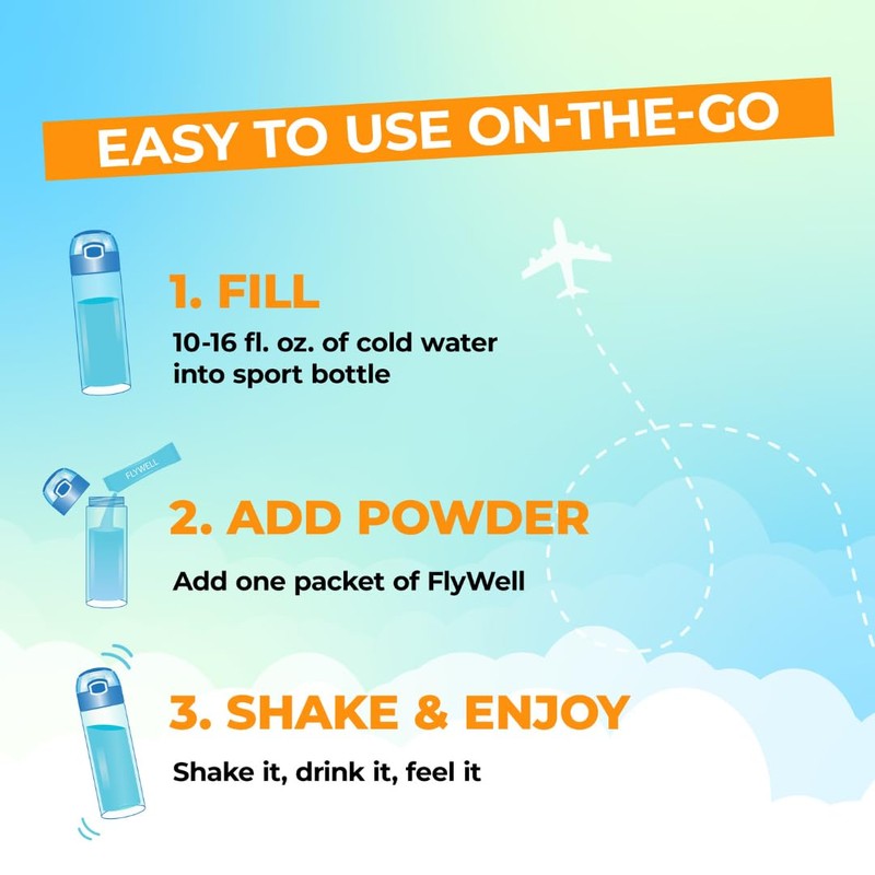 - TRAVEL SIMPLIFIED: Forget the hassle of carrying multiple vitamin bottles. FlyWell offers comprehensive support for hydration, immunity, relaxation, digestion, and circulation in a single TSA-friendly packetjust rip, pour, and enjoy the convenience of travel-ready wellness.